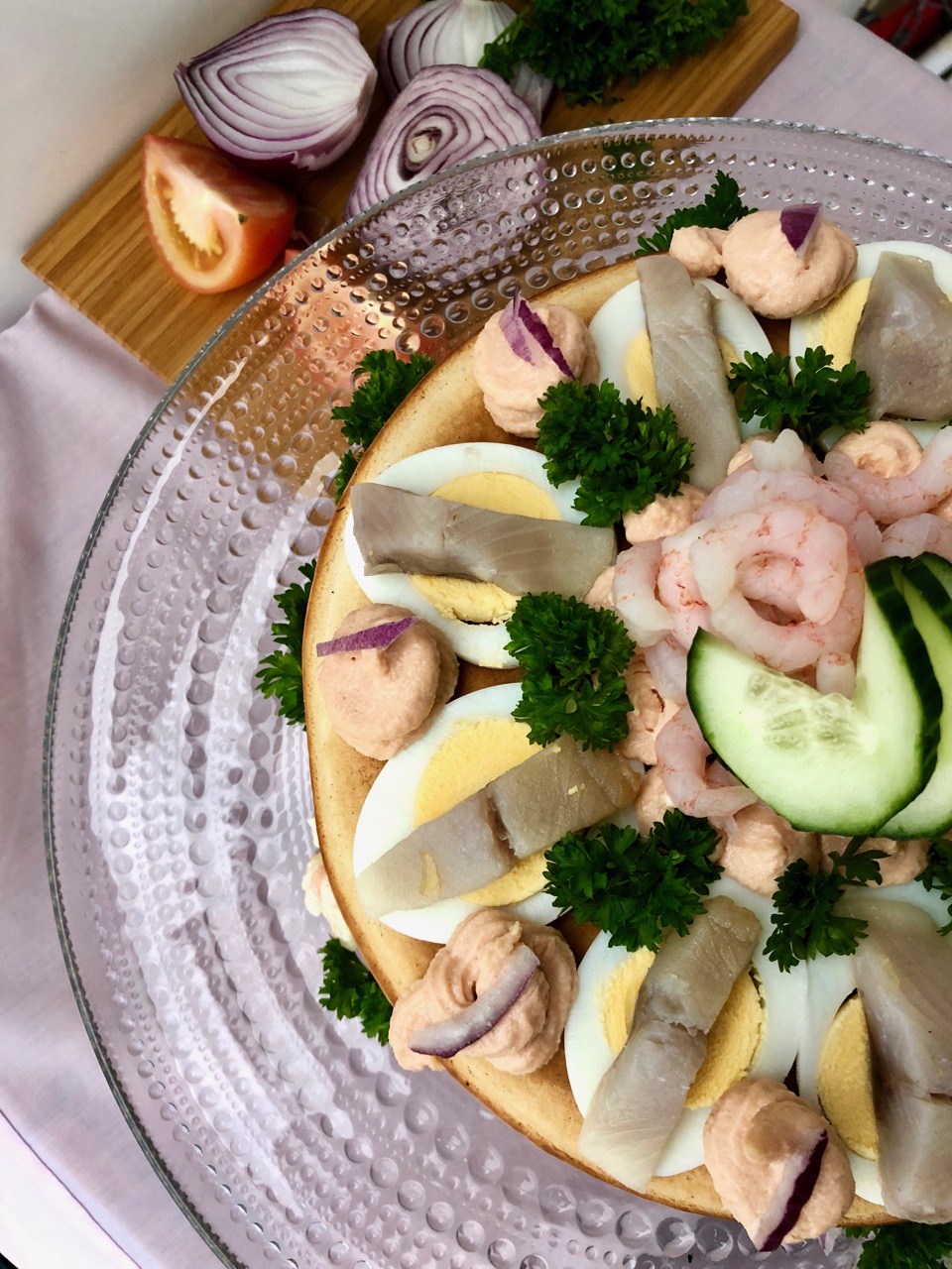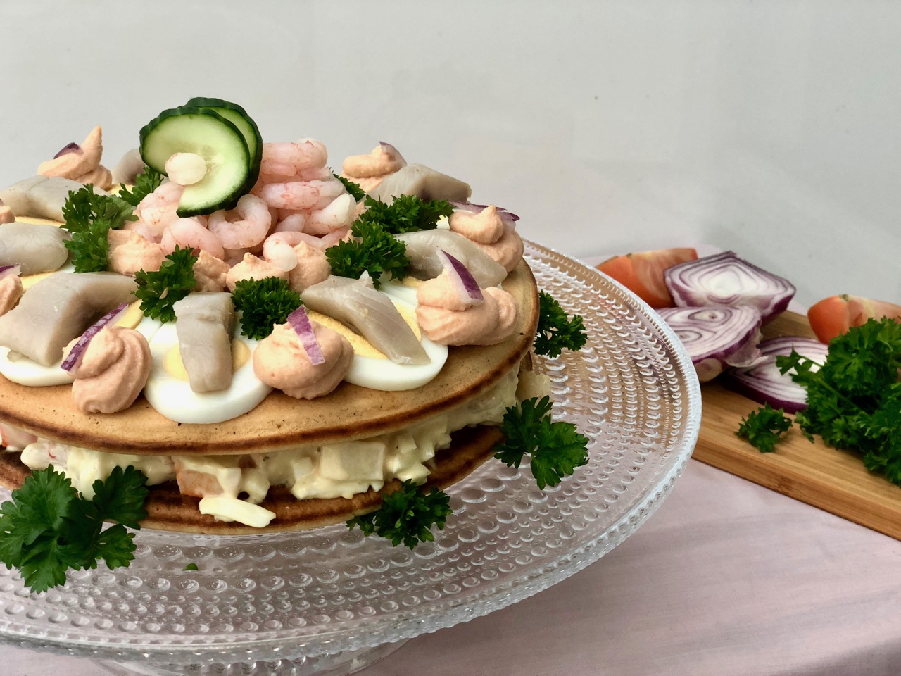 Er að missa mig í brauðtertunum. Á milli fór hefðbundið rækjusalat plús surimi. Ofan á eru soðin egg, laxamús úr túbu frá ABBA (samt ekki hljómsveitinni…), síld, rækjur, rauðlaukur, gúrkur og steinselja. Það er nú eins með þessar brauðtertur og allar hinar; Gefið hugmyndafluginu lausan tauminn þegar þið farið að skreyta.