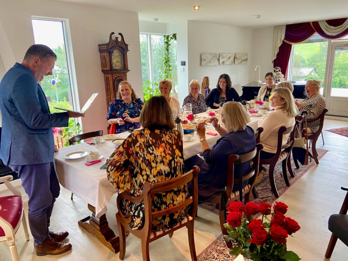 F.v. Elísabet, Steinunn, Helga, Bergdís, Bjarney, Vilborg, Sólveig, Jóna, Esther, Soffía, Guðrún, Vildís, Kristín og SvanhvítHommabrauðið góða, gerbollur, flatbrauð með hangikjöti, möndlukökur og marengsbombaLesið úr óborganlega skemmtilegum jólakortum sem Bergþór fær frá leyndum, óþekktum aðdáanda.Íslenskt Limoncello. Sætur og bragðmikill líkjör úr lífrænum ítölskum sítrónum og fersku íslensku bergvatni sem vel má mæla með. – LIMONCELLO.ISGúrkusamlokur, flatbrauð, möndlukökur, marengsterta með kókosbollum og marengs og rabarbara- og bláberjapæSteinunn og Bergdís fínisera borðið. Neðst er rabarbara- og bláberjapæ, ástarpungar, hommabrauðið góða með reyktum laxi, laxarúllur og ýmislegt fleira.Marengsterta með berjum og kókosbollum sem Vilborg kom með