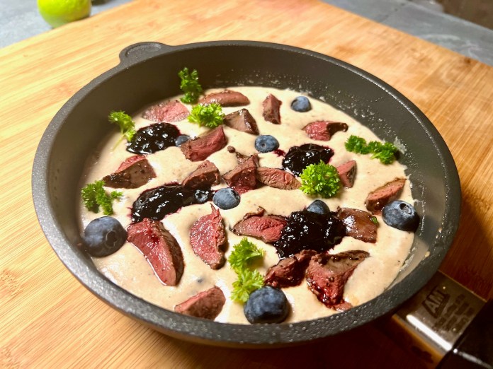 Sósunni hellti ég í bökuform, skar bringurnar í bita og stakk tannstöngli í hvern og setti í sósuna og hrútaberjahlaup á milli.