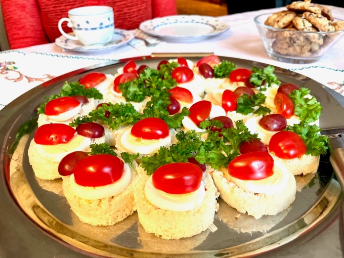 Öllum hráefnunum blandað saman og smurt á rúllutertubrauðið og því rúllað þétt saman. Örlitlu mæjónesi smurt yfir. Brauðið síðan skorið í sneiðar sem skreyttar eru með eggi, gúrku, vínberjum og steinselju.
