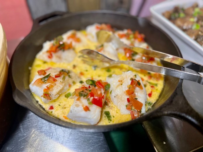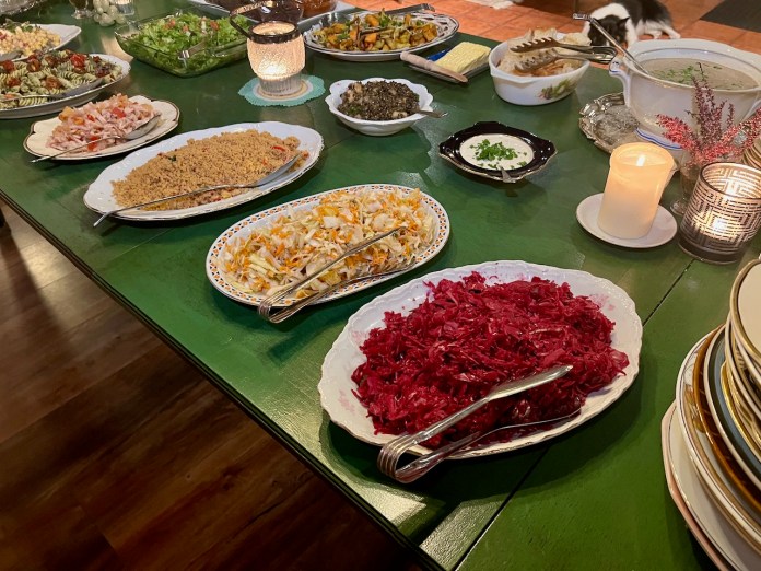 Boðið er upp á hlaðborð á kvöldin, sem er nokkuð breytilegt. Úrvalið var mikið, allt frá bauna- eða kúskúsrétti, kimchi, sýrðum salötum til lambalæris og löngu sem bragðaðist eins og humar, svo vel var hún elduð. Maturinn var mjög lystugur og sveppasúpan sennilega sú besta sem ég hef smakkað.