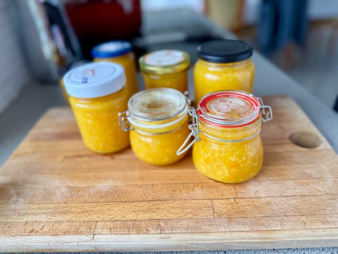 Það er ótrúlega auðvelt að útbúa marmelaði, en gott er að hafa í huga að appelsínur eru missætar og ágætt að hafa það í huga þegar sykurinn er mældur. Ágætt að byrja á t.d. 400 g og bæta svo við. Þegar marmelaðið er tilbúið finnst mér ágætt að setja eins og eina matskeið af því á disk og kæla í ísskápnum. Þannig er hægt að finna út hvort er nægur hleypir. Ef það er of lint má bæta við sultuhleypi.